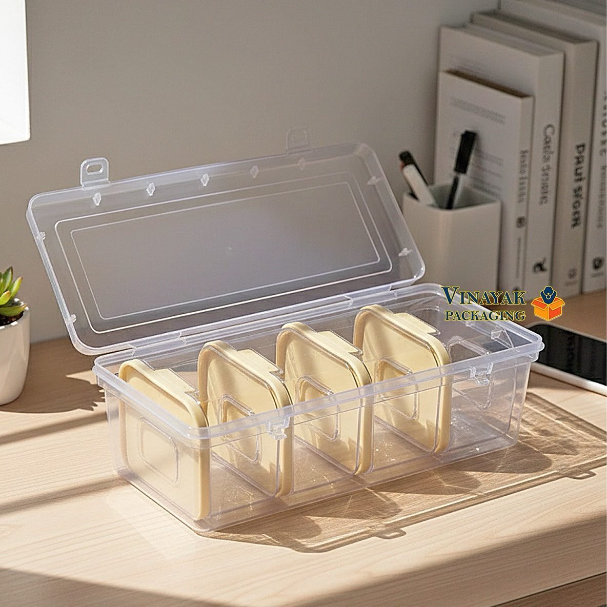 Premium clear plastic multi-compartment storage box with secure flip-top lid.