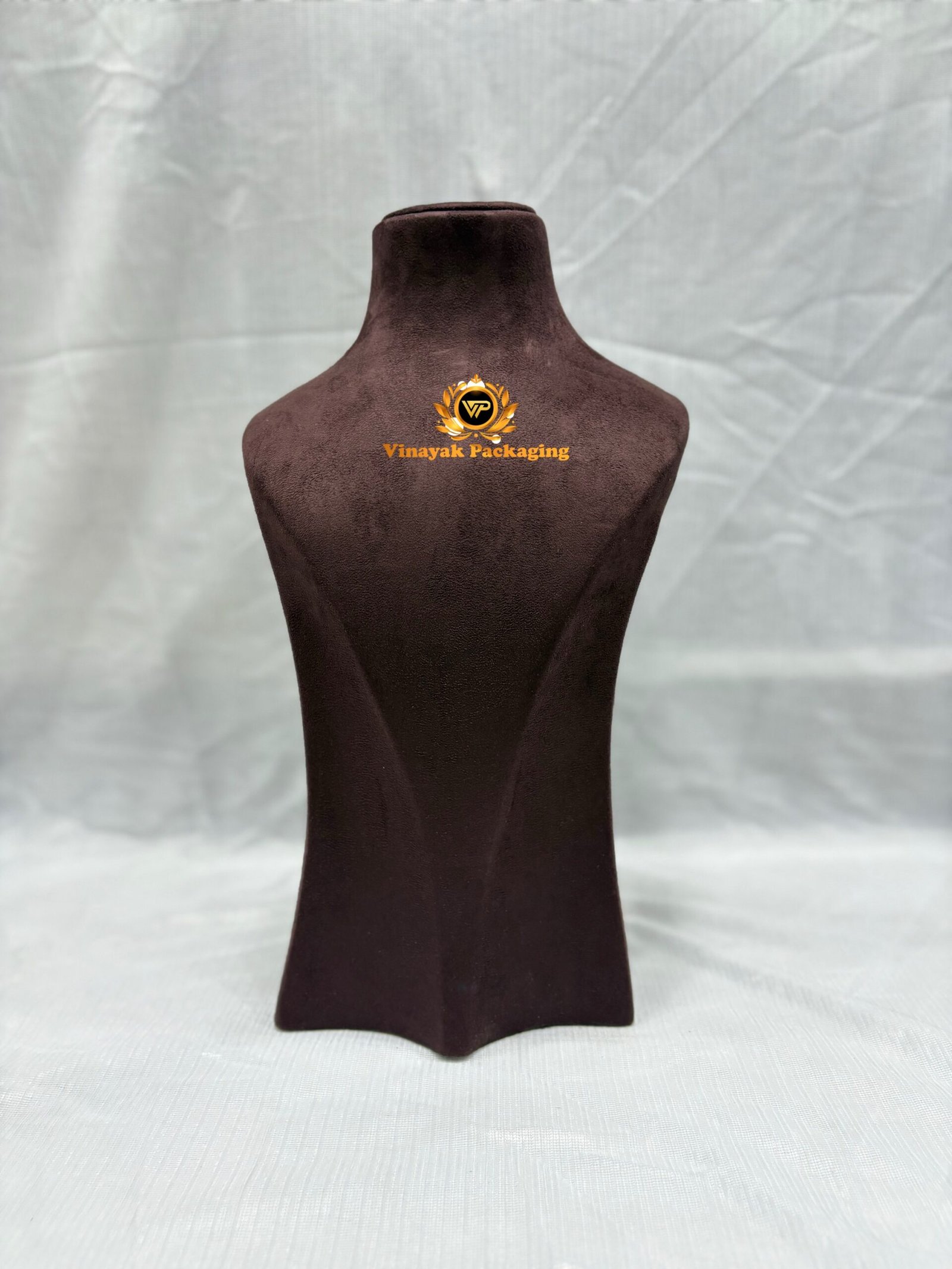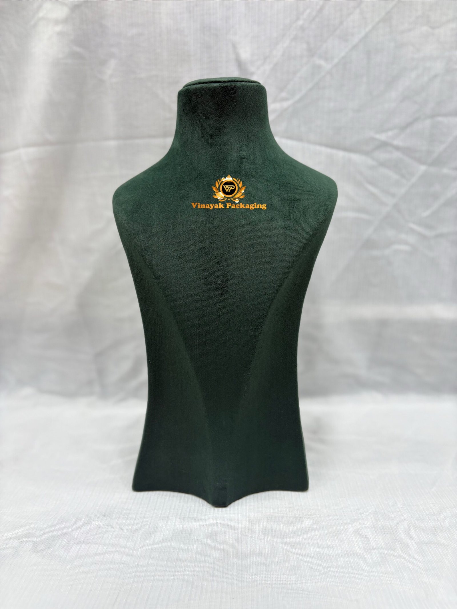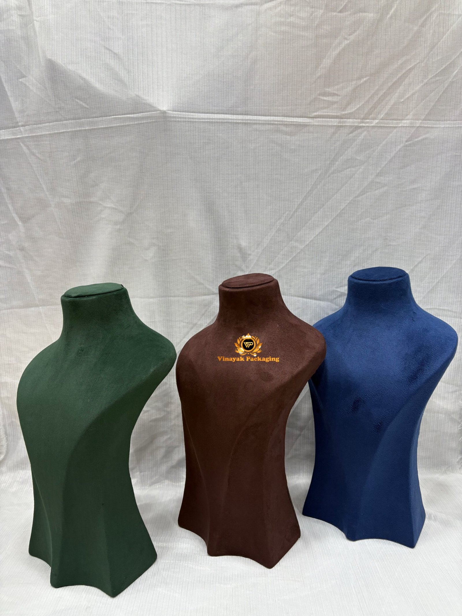 Premium velvet jewellery display stands in rich green, brown, and blue shades.