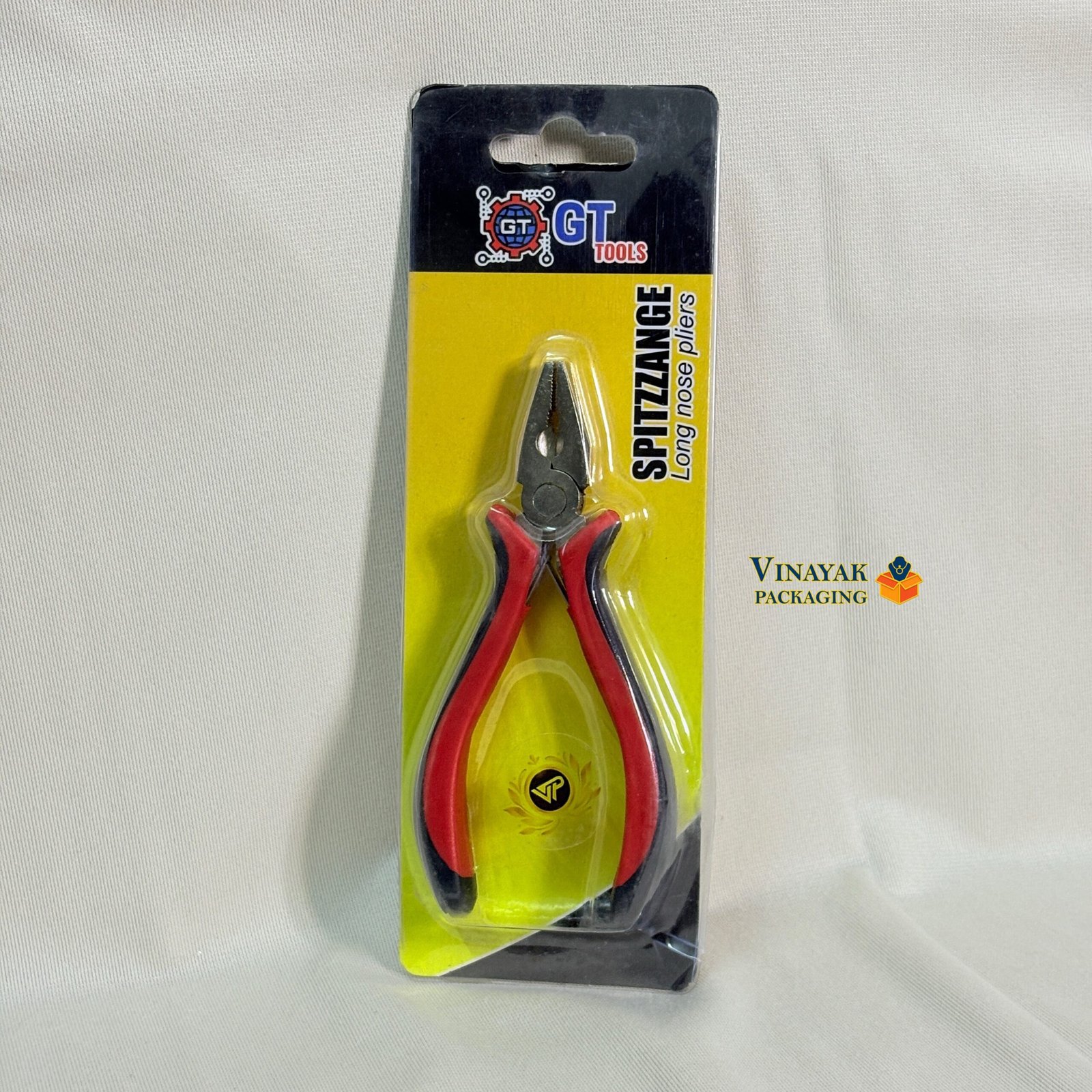 Long nose pliers in durable retail blister packing.