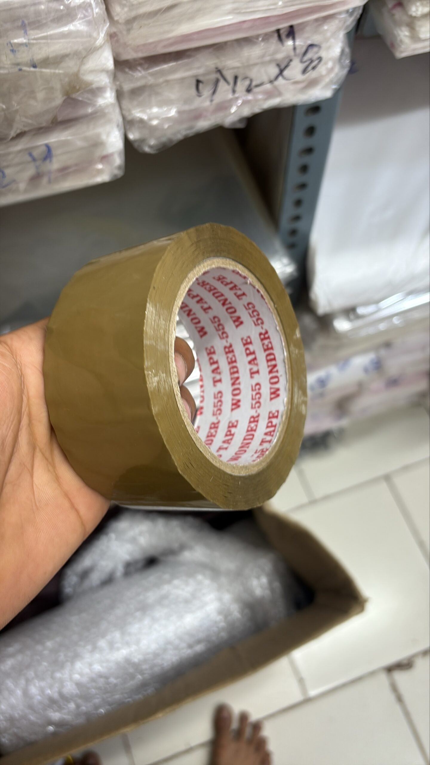 Transparent adhesive packing tape.
