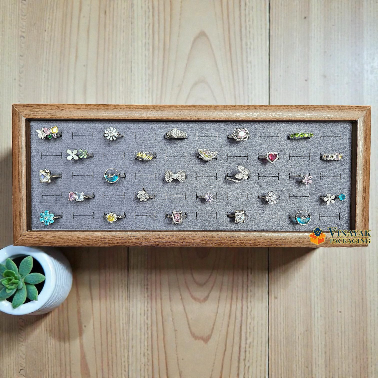 Elegant wooden ring display tray with a smooth natural finish for a premium showroom look.